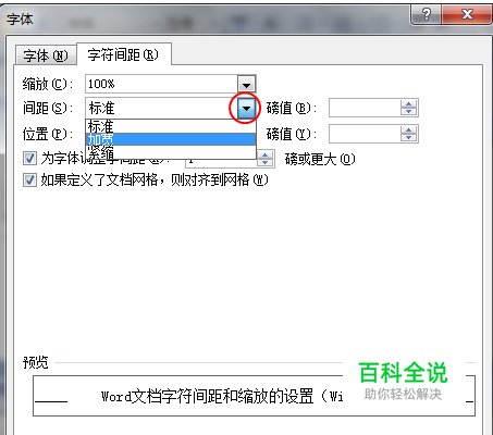 实例:将标题内容“Word文档字符间距和缩放的设置(Windows7)”的字符间距调整为加宽3磅,缩放150%。