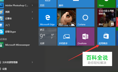 首先打开win10开始菜单,点击【应用商店】。然后搜索【microsoft minesweeper】,点击搜索。