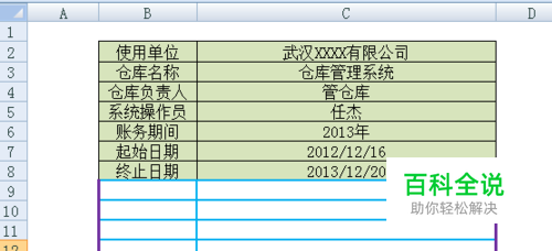 新建基础资料 ——用户信息表 B2输入使用单位;B3输入仓库名称;B4输入仓库负责人;B5系统操作员;B6输入账务时间;B7输入起始日期;B8输入终止日期等项目; 分别在D2\D3\D4\D5\D6\D7\D8中填入相应内容。