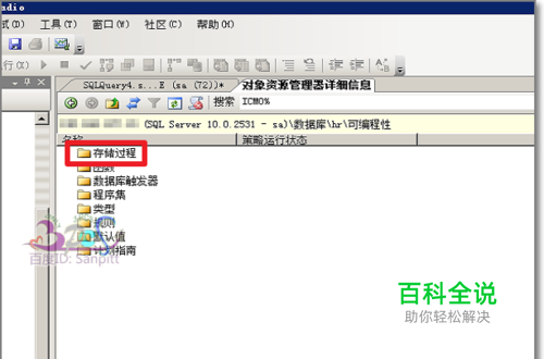 打开SQL Server Management Studio找到存储过程所在的数据库。在对象资源管理器详细信息中可以看到存储过程的文件夹。