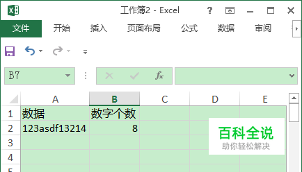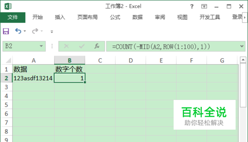 在B2单元格中输入公式 =COUNT(-MID(A2,ROW(1:100),1)) 结果如下图所示: