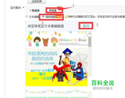 首先,打开自己的详情编辑页面,3步:1.手机端2.模板编辑3.修改
