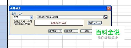 拉动条件格式窗口左端条件1(1)的下拉框,选择公式。在后面的公式输入行中输入=COUNTIF(A:A,A2)>1(注:英文半角输入状态)。