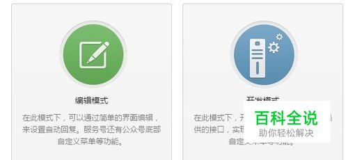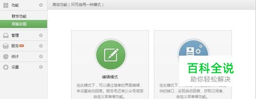 第二步 在这里我要说一下,因为微信官方的限制,在高级功能里面编辑模式已开发模式只能选择一种模式开启,开发模式一般有专业开发团队进行开发和接入,而我们所需要的只要进入编辑模式就足可以达到一般的互动效果了。不过,这两者可以相互切换的。