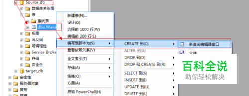 首先,打开并连接Sql Server,在源数据库Source_db(源数据库名称)上右键,然后依次点击“编写表脚本为”→“CREATE到”→“新查询编辑器窗口”。