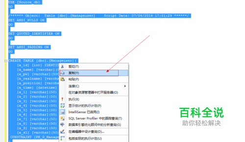 新建查询,然后右键”粘贴“(或ctrl+v);如图所示,将代码中Source_db(源数据库名)改为target_db(目标数据库名)。接着右键单击”执行“执行代码。