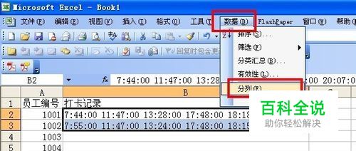 选中所有打卡记录,如下图所示,依次打开“数据”-“分列”菜单。