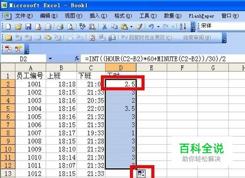 如下图所示,在D2里输入“=INT((HOUR(C2-B2)*60+MINUTE(C2-B2))/30)/2”,利用这个公式即可计算出编号为1001的员工的加班工时。 HOUR(C2-B2)是计算上下班时刻的时位差,然后乘以60换算成分钟;MINUTE(C2-B2)计算上下班时刻的分位差,结果是分钟。把时位差和分位差相加后除以30(半小时),即可计算出加班多少个基准单位工时(半小时),INT函数则是舍弃结果的小数部分(也就是忽略不足半小时的加班时间不计),最后把结果除以2换算成小时以方便考核绩效和核发加班费。