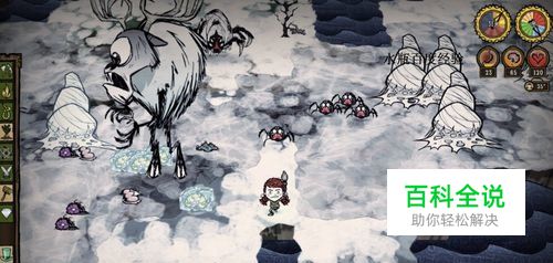蜘蛛女皇虽然彪悍但生命值远不如巨鹿,所以不出意外,蜘蛛女皇最终会被冬季boss巨鹿击杀。这时候玩家有两个选择: 第一就是引诱巨鹿到别的生物地盘; 第二就是开打。先前已经告诉大家了打巨鹿会掉精神值,笔者都是打几下跑几下然后吃肉干,精神补得差不多了再上去撸巨鹿。 打巨鹿一定要注意体温值,来不及生火就用火把点树,也挺管用的。
