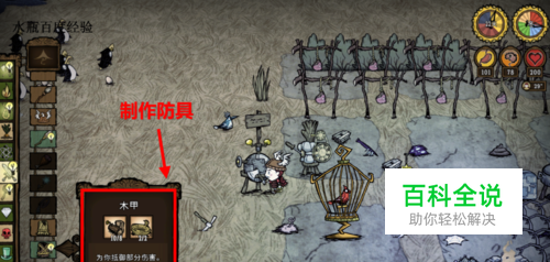 饥荒从进入冬季第一天开始,就要为打独眼巨鹿做好准备。来谈谈必须要做的准备工作。 首先我们要解锁防具,木甲就很有用,也是第一次过冬能拿出的最好装备,如果玩的不是女武神最好还要出猪皮帽。
