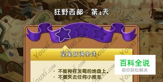 植物大战僵尸2中文版狂野西部第四天全三星攻略_在植物大战僵尸2狂野西部第四天中,控制植物的阵法是关键,因此在这三关中限制我们的条件很多,所以一定要小心才能获得星星。那么植物大战僵尸2狂野西部第四天三星要怎么过呢? 下面小编就带大家一起来看看植物大战僵尸2狂野西部第四天三星攻略。 一星达成目标: 不要种在发霉的地盘上。 不要失去任何小推车。 植物选择: 这一关因为有淘金僵尸,所以如果大家没有双向射手,就必须要使用菜问或者地刺。 植物:坚果,卷心菜,冰冻生菜,双胞向日葵,菜问,双重射手,窝瓜。可放弃的植物:窝瓜。替代植物:火龙草,地刺。 植物大战僵尸2狂野西部第四天三星攻略:一星 由于这一关的最后2排不能种植物,因此我们这里的战场就缩短了大一半,这里当种了2株双胞向日葵的时候,就要开始种卷心菜或其他攻击植物了,同时用冰冻生菜冻住第一只僵尸。 然后继续补卷心菜,当出现了路障僵尸后用坚果挡住,因此攻击力会不够。 当第一大波僵尸来的时候,就会出现斗篷僵尸,如果它身上带有盔甲,那么这时一定要用窝瓜或者土豆炸弹来将其杀死。不过这里建议用窝瓜,因此土豆炸弹的种植CD时间有点久。 接下来一边补双胞向日葵,一边种双重射手来增加攻击,同时前排放上坚果来挡住僵尸。而那一个轨道位置就种上菜问或双向射手,因此只有这样才能杀死淘金僵尸。