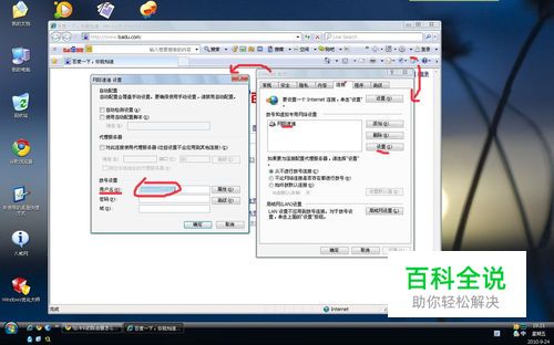 在上网帐号那里的输入:你打开那个可以上网的电脑的IE浏览器的属性,找到连接选项,那里有一串字符,就是帐号(这个帐号不能直接输入你买的上网卡的帐号)如图: ;密码输入你买的上网卡的密码。下一步,就会自动拨号连接了。