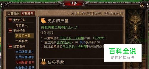 在游戏中,玩家每天可从指定NPC处接到日常任务,每次可以从列表中的4个任务中挑选一个完成,任务有为民除害和收集物资等种类,需要玩家与指定NPC对话以及进行一定的战斗。完成后会给予一定的奖励,如资源和民心等等。这些任务可以通过挂机来自动完成,奖励相同。而且,日常任务是获得“民心”的唯一途径。民心对于城市的建设发展有着至关重要的作用。民心越高,黄金和木材的基础产量也就越高。