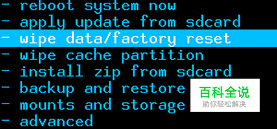 清除成功后,手机会自动重启。 部分用户手机无法连接甜椒(调试模式未开启),则参考方法二。 方法二.手动清除手机数据。 该方法会恢复出厂设置,不影响存储卡数据。 1.手机进入RECOVERY模式,了解方法。 使用音量键选择,电源键或菜单键执行(具体因手机而异,请自行测试)。 2.清空所有数据 执行 wipe data/factory reset(中文一般为清除数据)和wipe cache partition(中文一般为清除缓存)两项。