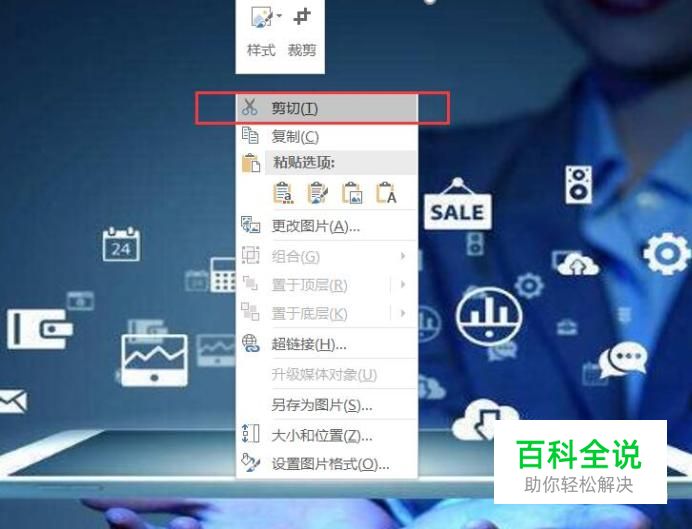 我们使用鼠标点击其中的一张幻灯片,在点击了幻灯片背景图片之后,击右键,选择“剪切”按钮。