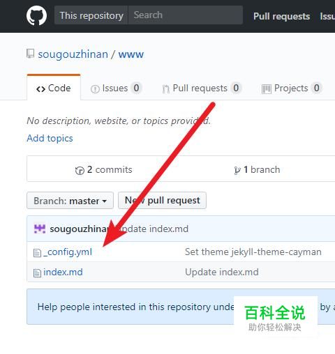 在这里我们自己新建一个网页,不使用他的主题模板,之前删除的两个文件就是模板。新建一个文件,在图中红色文件夹名称处,可以自定义网页名称,每次操作都要点击底部的【commit changes】,网页内容输入的是:欢迎来到我的搜狗指南!!