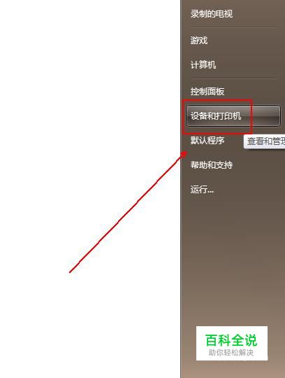 点击电脑桌面左下角的win图标,在弹出的菜单列表中单击“设备和打印机”选项。