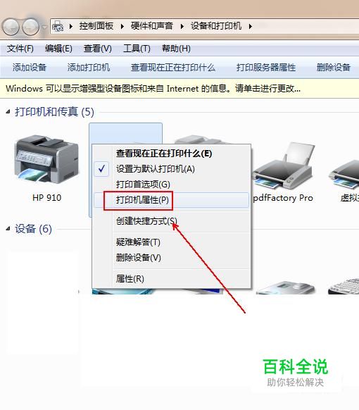 右击正在使用的打印机,在弹出的菜单列表中选择“打印机属性”选项。