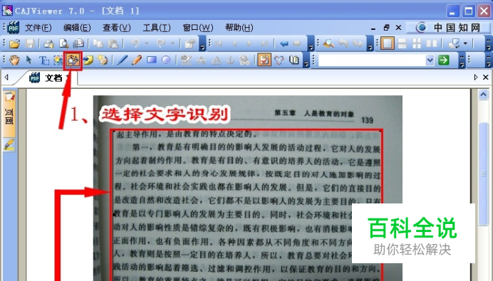 软件步骤: 1、在电脑中安装 DoPDF和CAJViewer 2、用数码相机把需要的文字拍下来(照片效果越好,可以大大缩小转换文字的误差率) 例如: 3、在Word中插入你用数码相机照的书上的文字(打开Word——插入菜单——图片——来自文件——选择照片——插入) 4、在word中选择文件菜单——打印——在打印机选项中选择DoPDF——确定——点击“浏览”选项——选择文件保存的位置和填写文件名称——保存——确定 5、按照上面的步骤,电脑会自动打开AJViewer软件,若没有自动打开该软件,可以自己打开CAJViewer软件,然后在CAJViewer中打开刚刚转换的PDF文件。 6、选择CAJViewer中的,然后在需要的文字部分拖动鼠标画出虚线。 7、点击发送到word按钮,就可以转换成word文件了。可以编辑了。 第6、7步骤图片如下: