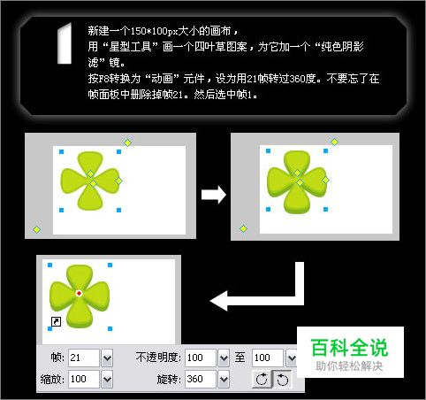 1. 新建一个150*100px大小的画布,用“星型工具”画一个四叶草图案,为它加一个“纯色阴影滤”镜。 按F8转换为“动画”元件,设为用21帧转过360度。不要忘了在帧面板中删除掉帧21。然后选中帧1。