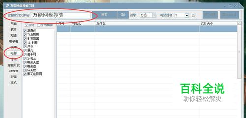 打开工具,点击“电影”功能。输入电影名,选择搜索网站,可直接点击“全选”,在网站中搜索资源。