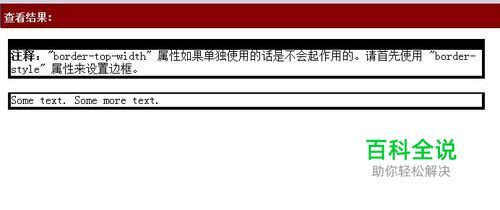 <html> <head> <style type="text/css"> p.one { border-style: solid; border-top-width: 15px } p.two { border-style: solid; border-top-width: thin } </style> </head> <body> <p class="one"><b>注释:</b>"border-top-width" 属性如果单独使用的话是不会起作用的。请首先使用 "border-style" 属性来设置边框。</p> <p class="two">Some text. Some more text.</p> </body> </html>