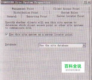在弹出的对话框中选择Serverlocator Point 选项卡,选中 Use this site system as a server locator point 复选框,并且在 Database 下来列表框中选择Use the site database