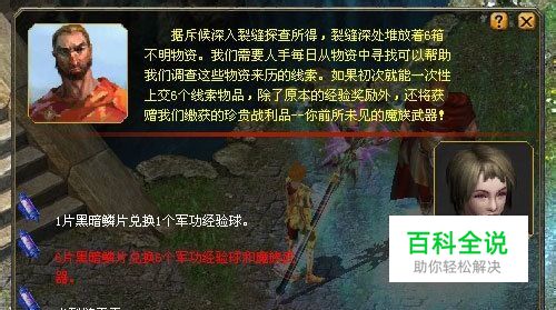 从旁边的传送门返回,把获得的黑暗鳞片带给皇家卫队长换取奖励。初次上交便一次性上交6片黑暗鳞片者,还将额外获得一个魔族武器。