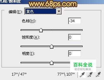1、打开原图素材,创建色相/饱和度调整图层,选择黄色,用吸管吸取草地的颜色再调整,参数设置如图1。确定后选择蓝色,用吸管吸取天空部分的颜色再调整
