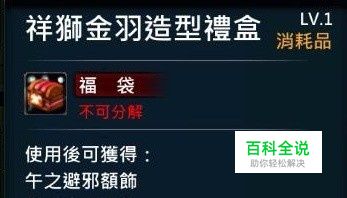 祥獅金羽造型禮盒 消耗品 福袋 使用後可獲得: 午之辟邪額飾 僧兵金翼面飾