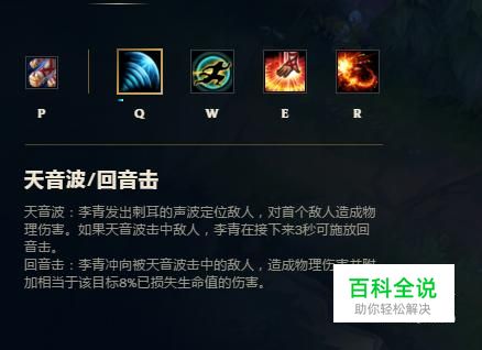 Q技能:q技能的准确性是神瞎和小学瞎的本质区别,q技能的第一段命中敌人之后,在这期间敌人掉的血量越多,触发第二段q的伤害就越高,所以各位玩家尽量在第一段q命中之后多给敌人多造成一些伤害以增加自己第二段q的伤害。