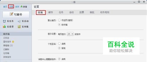 2.点击“设置”,进入常规设置页面。在常规设置页面中,可以进行默认首页,显示设置,个性签名和消息中心提醒新信件的设置。