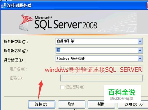 首先打开SQL SERVER 2008数据库管理工具,然后选择服务器,选择Windows身份验证进行连接,如下图所示