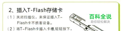 安装TF卡: TF卡插槽位于扫描仪的侧面中间位置,很容易就能找到,扫描仪正放时,将TF卡的金属面朝上,插入TF卡(拔出TF卡:只需向内按压一下TF卡,即可弹出TF卡)。如果没有安装TF卡,扫描仪是不能工作的。该扫描仪支持TF卡热插拔,也就是在扫描仪开机状态下也可以插上或者拔掉TF卡。但是请不要在扫描过程中拔掉TF卡,扫描过程中,TF卡是正在读写数据的,这时拔掉TF卡,TF卡内的数据极有可能会损坏。