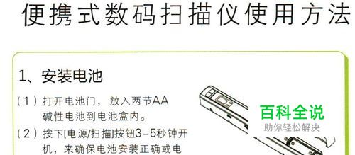 1、安装电池: 扫描仪上面那个凸起的银灰色盖子下面就是电池仓,用手指按住前端,向后推即可打开电池仓,按照正负极指示装好电池。电池必须是五号电池,也就是AA电池。当长时间不用时,请把电池取出,以免电池老化,腐蚀机器。