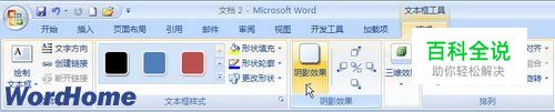 第1步,打开Word2007文档窗口,单击选中文本框,在打开的“格式”功能区中单击“阴影效果”分组中“阴影效果”按钮,如图2009010101所示。图2009010101 单击“阴影效果”按钮