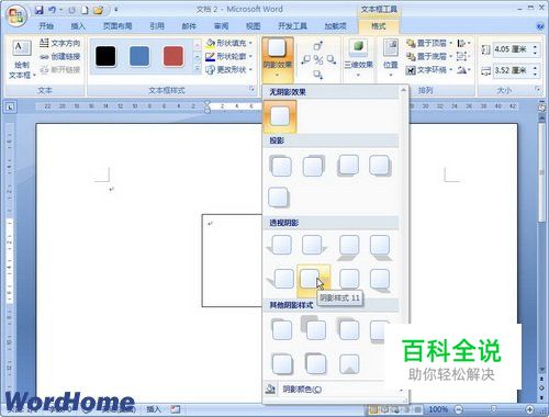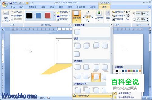Word2007为文本框提供了多种阴影效果,例如投影、透视阴影等阴影效果。用户不仅可以选择合适的阴影效果,还可以对这些阴影进行颜色、阴影位置等方面的设置。在Word2007文档中设置文本框阴影效果的步骤如下所述: