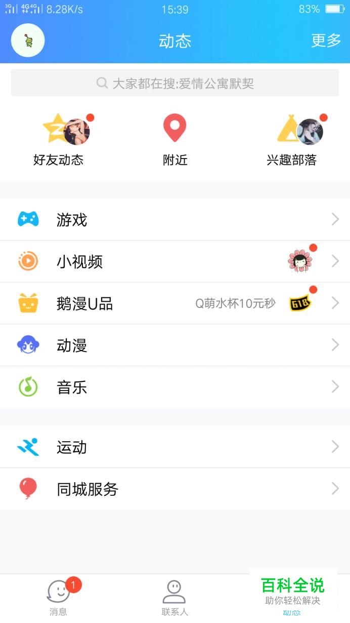 进入手机QQ之后,点击到动态界面,在动态界面有多个选项,其中有一个就是“运动”。