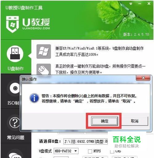 三、安装U教授软件。安装完成后打开U教授软件,插入U盘,点击“一键制作usb启动盘”按钮;