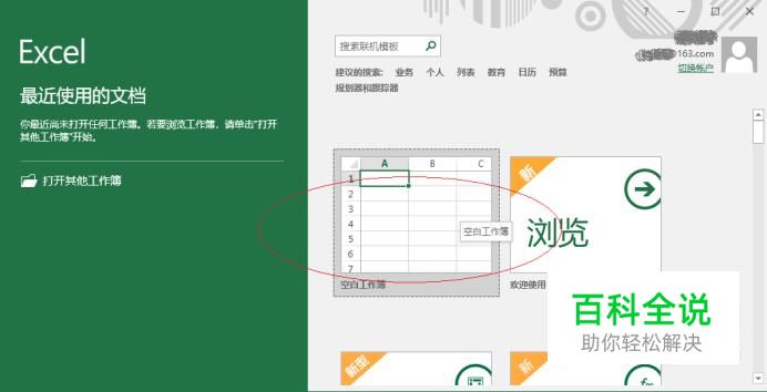 启动Excel 2016电子表格应用软件,如图所示点击屏幕右侧新建空白工作簿。
