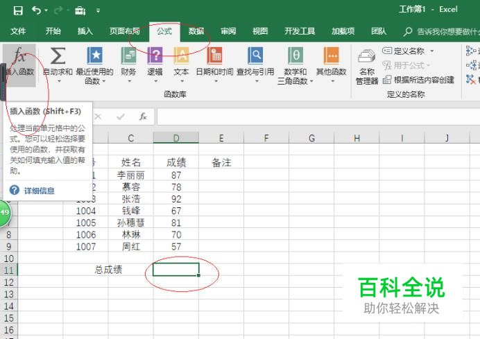按照学院教务部数据创建工作簿文档,如图所示。选中"总成绩"单元格数据区域,点击"公式→函数库→插入函数"图标。