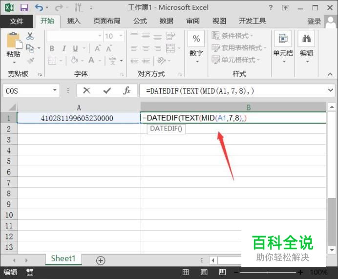 打开excel之后我们在单元格内输入身份证号,然后在选择单元格输入=DATEDIF()函数,如图所示: