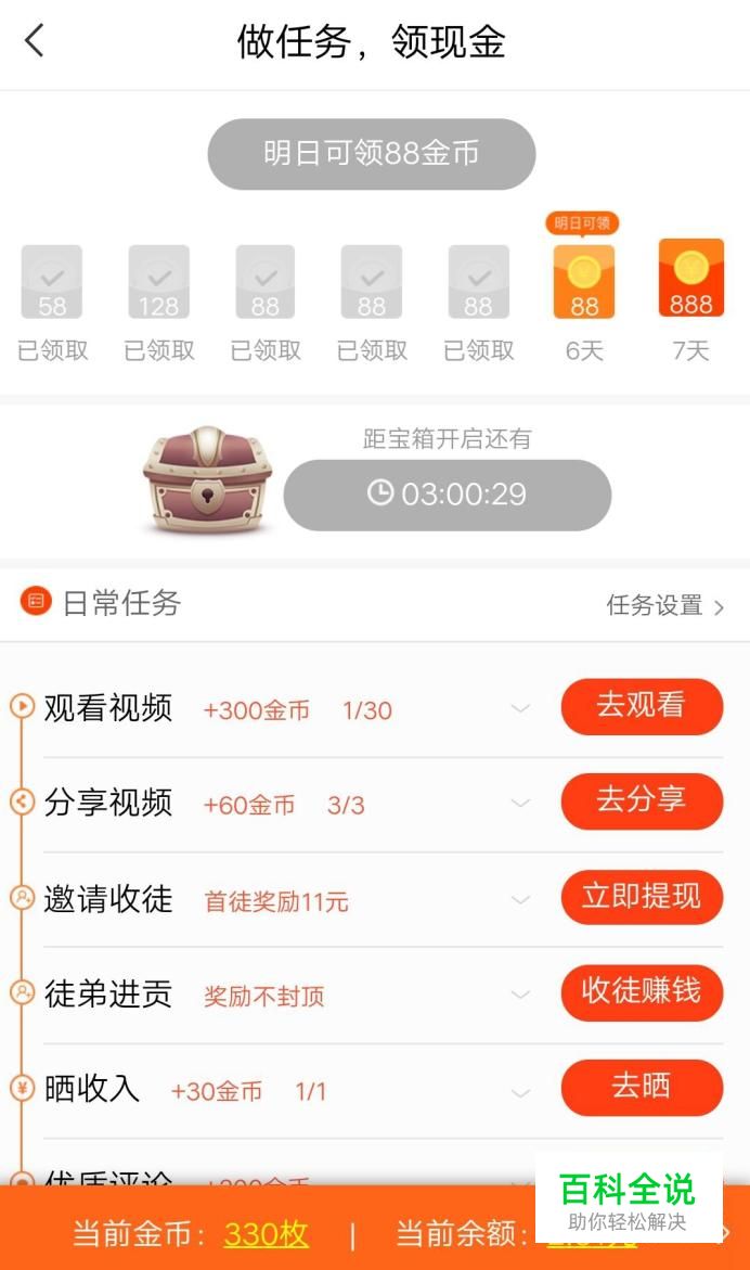 在这里有很多的挣钱任务,包括每日签到得金币,还有每日4小时开启一次的保险奖励。下面还有常规的任务,包括每日观看可得300金币,分享以及收徒奖励等待。