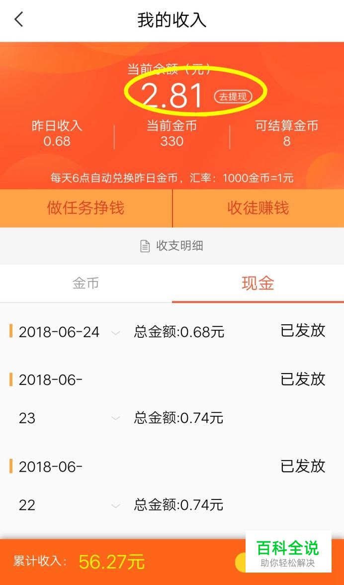 在我的收入里可以查看我们每天的金币收入情况,金币会在每天的6点兑换成现金,一般1000金币大约1元人民币。