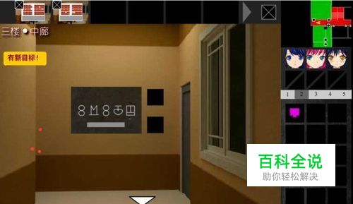 出门,将所有的9个方块,放入门口的机关上,将数字和对应的方块记下来。然后去各个教室,开门(门帮边有 会发出 滴滴声的机关,点击那个门,灯泡 佩芝会开。其他门交给素素。)