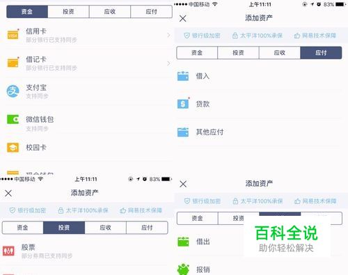 网易有钱 评分:4.5分 点评: 涵盖大部分资产类别,包括投资资产和生活类资产,并支持自动记账 网易有钱的资产记录主要分为资金、投资、应收和应付。 资金包含信用卡、银行卡以及支付宝和微信,并且都可以进行自动同步,满足简便记账的需求,用户更能坚持记账。 投资中包括股票、基金、银行理财、债券和互联网理财,对于房产车产也可以进行添加。 应收对于用户来说是一个最有用的功能,不会忘记别人还欠你钱,以及公司可报销明细一次性就能整理出来。 应付即负债也是全资产中非常重要的一环,网易有钱中的借入和贷款功能对于有房贷和车贷的朋友们非常实用,到了还款日还会有提示。