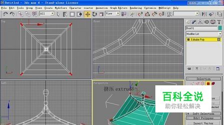 在修改命令面板中,进入点的次物体层级中,对点进行调整,调整后的形状如下图所示。进入多边形次物体层级中,选择如图所示的多边形,使用EXTRUDE命令对它进行挤出操作,设置EXTRUSION HEIGHT的值为26,如下图所示。本节将详细讲解各个合成对象工具,并对比较重要的Morph和Boolean工具配以实例说明。