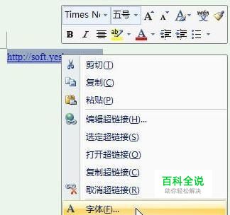 仅对单个超链接文字做处理 如果仅仅对一个超链接文字做处理,方法非常简单。选中文档中的超链文字,点击右键,从菜单中选择“字体”。