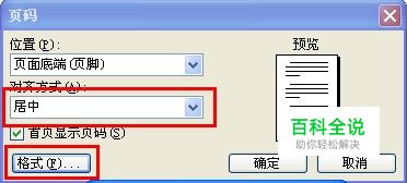 3、在“第三页”插入完“分隔符”后,鼠标不要移动,选择菜单栏的“插入”在下拉菜单中选择“页码”,然后将“对齐方式”设置为“居中”,单击“格式”按钮,此时会弹出个“页码格式”窗口,我们选择“起始页码”在里面输入“1”,然后确定;