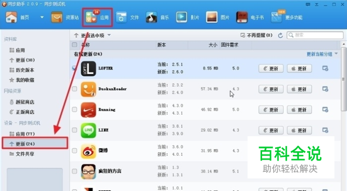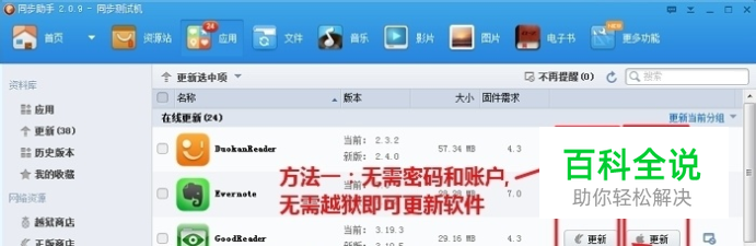 近日不少用户反馈,当初购买设备时直接在门店安装了很多的软件,之后软件升级需要密码,不知道店家Apple ID的密码怎么更新软件? 目前有两种方法来解决这一问题:一是用同步助手直接更新软件,无需密码,无需Apple ID也可升级;二是将店家的账户切换成自己的Apple ID来升级软件。具体操作如下: 1.下载安装同步助手 2.连接设备到电脑,运行同步助手,进入【应用】界面,然后选择设备底下的【更新】,即可看到软件更新列表 3.这里可选择从同步商店更新(左侧更新按钮),无需密码,无需Apple ID,也不需要越狱,就能免费升级正版软件,推荐使用。 当然也可选择从苹果商店更新(右侧更新按钮),但需要输入自己的Apple ID和密码来升级软件。
